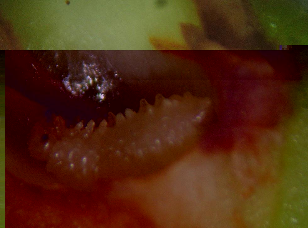 Stamane andando a passeggiare col cane mi sono imbattuto in un susino: ho controllato un poco e ho trovato frutticini attaccati dalla tentredine, così ho pensato di allegarti qualche foto della larvetta. La prima è fatta con una macro, le altre due allo stereo (la definizione è mediocre un po' perché la larva si contorceva e poi perché per fare foto da internet ci vogliono apparecchiature che costano molte migliaia di euro). Le larve delle tentredini si distinguono dai bruchi piuttosto facilmente: l'elemento morfologicamente importante è dato dalle pesudozampe che sono in numero di 7-8 (sia Hoplocampa minuta sia H. flava ne hanno sette) e dai segmenti addominali che sono dieci. Nella seconda foto si vedono un po' meglio le zampe toraciche (3 paia) e le pseudozampe addominali e in parte anche l'apparato boccale che è di tipo masticatore (le due spinosità marroncine che si intravvedono sono le mandibole). Nella terza foto ho cercato di mettere in primo piano il capo: la testa tonda e quei due occhietti a capocchia di spillo, tipici delle larve di tentredini, attirano subito l'attenzione.