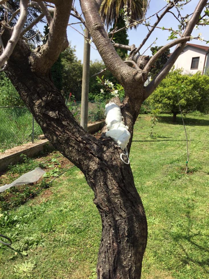 Allora ragazzi...ho pulito fin dove potevo! Poi col tuo dell'acqua, ho dato un altra pulita...fatta asciugare ci ho messo della polvere di stucco, ho spruzzato del baygon verde nella cavità! e poi poliuretano...tenete conto che ho immerso un rametto nella cavità e arriva fino a livello della terra! Temo sia stato accanimento terapeutico. Se fruttificherà...i frutti saranno commestibili?