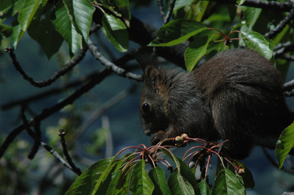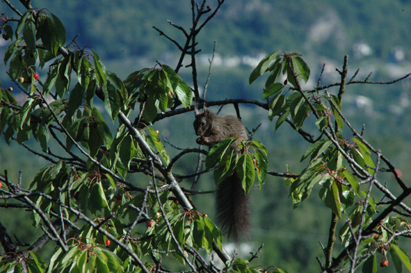 Ognuno ha gli animali suoi. A me le ciliegie se le sono mangiate i pennuti. Dubito che il tuo sciuride sia interessato all'uva: nel caso informaci che aggiorniamo i manuali di zoologia agraria. Hai per caso notato di che colore è la pancia? La specie Sciuris vulgaris presenta esemplari di colore che varia dal rosso-arancione al bruno (sembra in effetti quello), tuttavia esiste una specie nera con la pancia bianca originaria della Calabria e Basilicata (Sciuris meridionalis) e c'è chi dice di averlo avvistato anche al Settentrione.