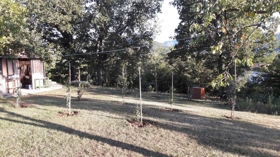 in questi ultimi due anni ho incominciato a mettere giù un po di piante per creare un frutteto familiare. Tradizionalmente dalle mie parti zona collinare oltrepo pavese si mettevano le piante ad una distanza di circa tre metri e si allevavano perlopiù a vaso lasciano 1 , 1 e mezzo di tronco in altezza. La lavorazione e pulizia del terreno è molto facile in questo modo.