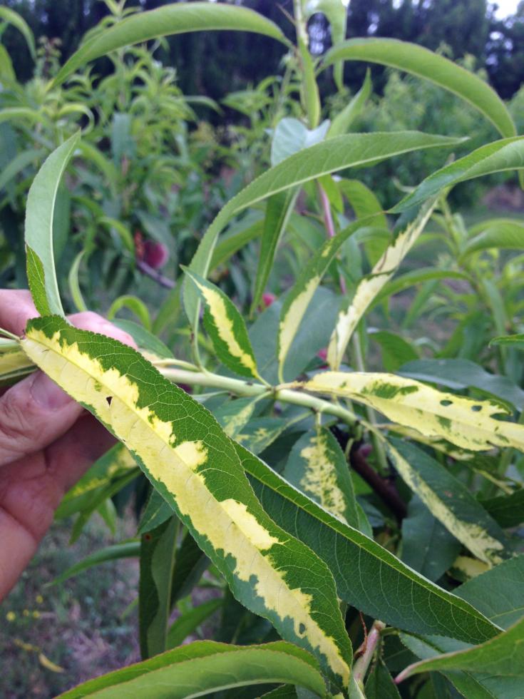 A me ricordano le chimere, cioè mutazioni naturali da parte di cellule meristematiche destinate in questo caso a originare le foglie: spesso sono settoriali e danno luogo a schiarimenti per mancanza di clorifilla a fianco di parti verdi. Su foglie sono note ad esempio su vite (vd. foto), non saprei dire su pesco.