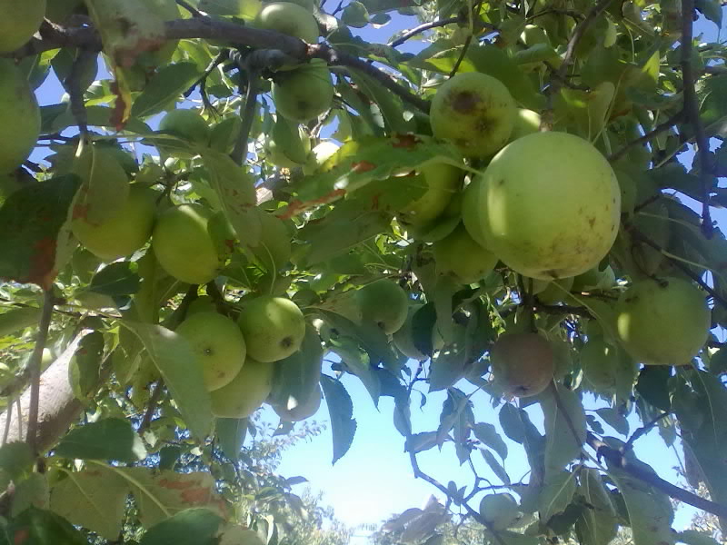 c'è un po di ticchiolatura (quelle macchie scure che si vedono sia sui frutti che su alcune foglie) ma non è un forte attacco. penso stiano cadendo perchè sono troppe e alcuni frutti vengono abortiti leggi questa scheda: http://www.agricoltura.regione.campania.it/difesa/fitopatologia/melo/melo_ticchiolatura.htmci sono suggerimenti e consigli anche per altre avversità del melo. fai trattenenti invernali? te li consiglio, a base di rame (poltiglia bordolese oppure ossicloruro di rame)