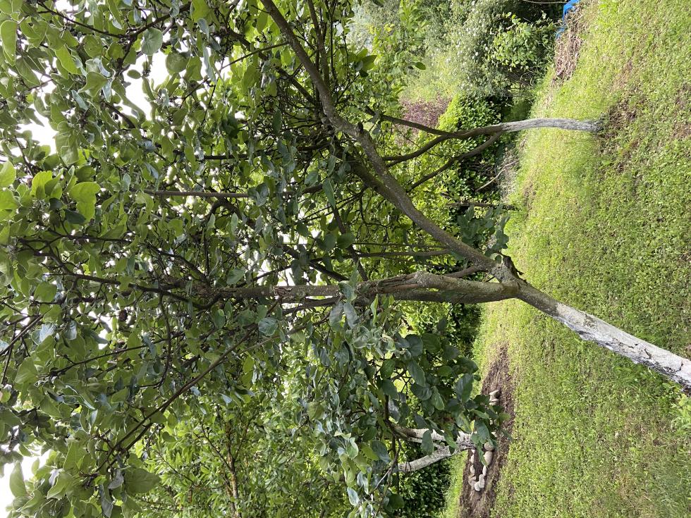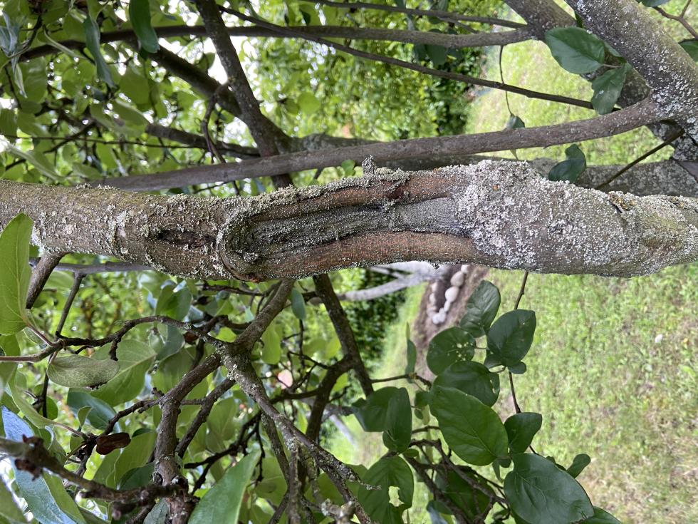 Vagando per l'orto di famiglia ho notato un albero che sembra colpito da qualche malattia, in particolare il tronco sembra "mezzo rotto". Date un'occhiata alle immagini allegate, secondo voi cosa puo' essere?