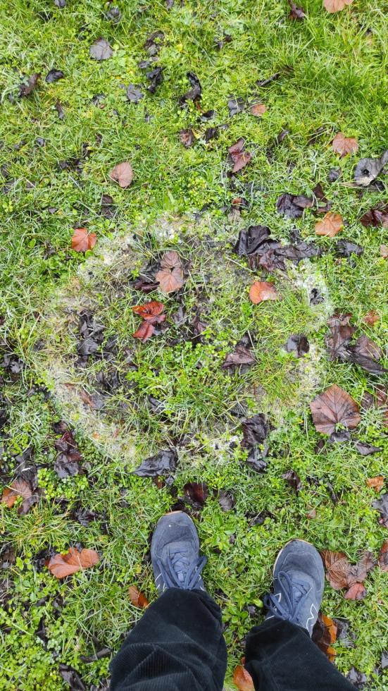 A fine dicembre ho notato questo strano cerchio leggermente ellittico in giardino. La circonferenza era di colore bianco (non era brina e nemmeno assomigliava ad una ragnatela) ma era formata da una specie di tessuto. Faccio presente che in quel luogo non ho mai poggiato nessun tipo di recipiente, nessun vaso, nessun portavaso. Il cerchio non è mai cambiato per una decina di giorni, poi, dopo una giornata di pioggia, la materia bianca è sparita, ma il segno del cerchio è comunque rimasto. Cosa potrebbe essere secondo voi?