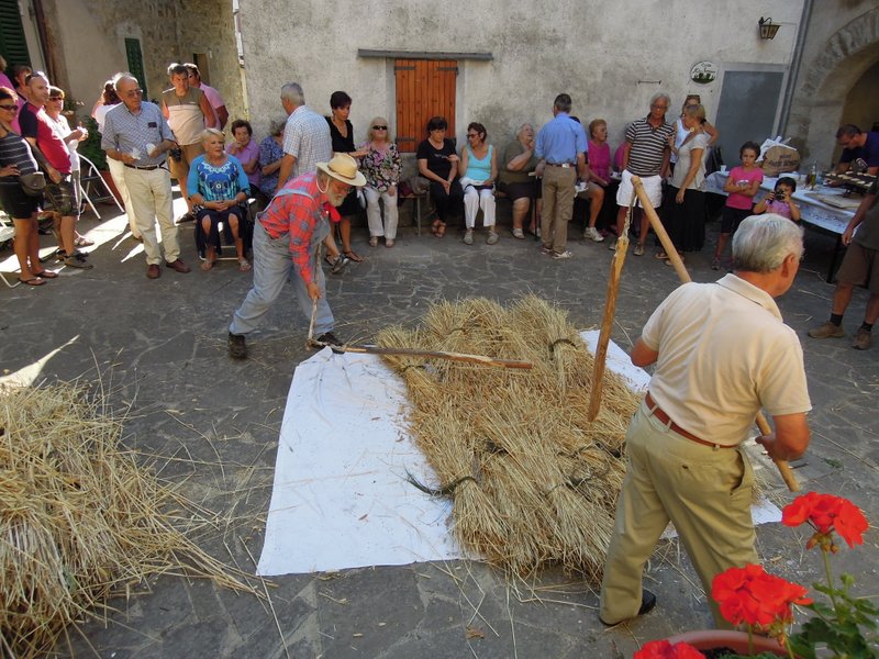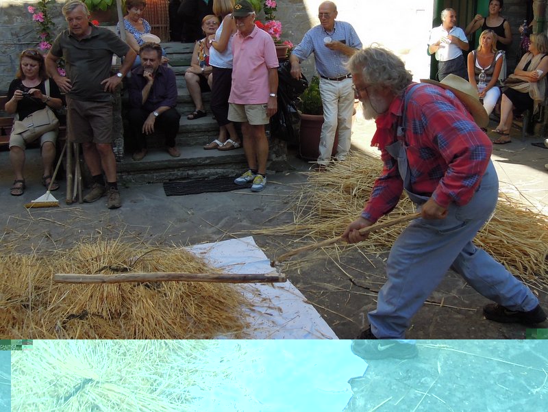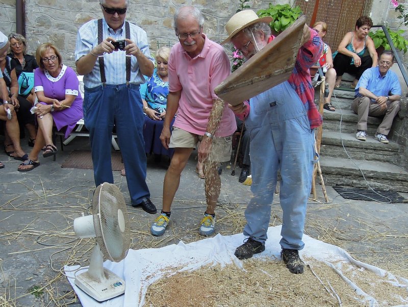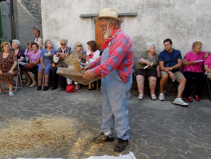 questo agosto ho battuto il grano coltivato in montagna da un mio cugino.. con i corgiali viene battuto su lenzuoli sul selciato della piazzetta Allegato: