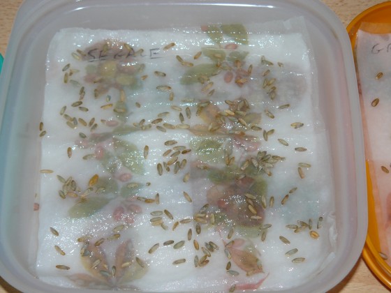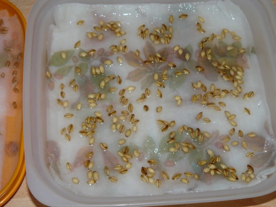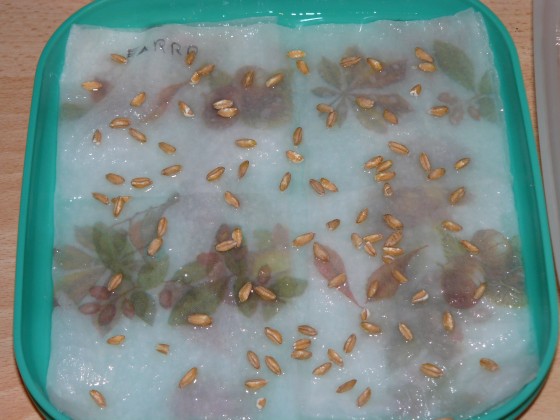 Finalmente ho recuperato un pò di "granaglie" farro, grano tenero, orzo e segale... tutti acquistati ad una rivendita vegana; sono bio per alimentazione umana però e non "sementi"! Visto che ormai credo di essere in mega ritardo per la semina autunnale, vedrò di riprovarci seminando a febbraio o marzo... nel frattempo ho provato a vedere se germinano in casa con un metodo "scolastico", e dopo 3 giorni ecco il risultato... cosa ne pensate?