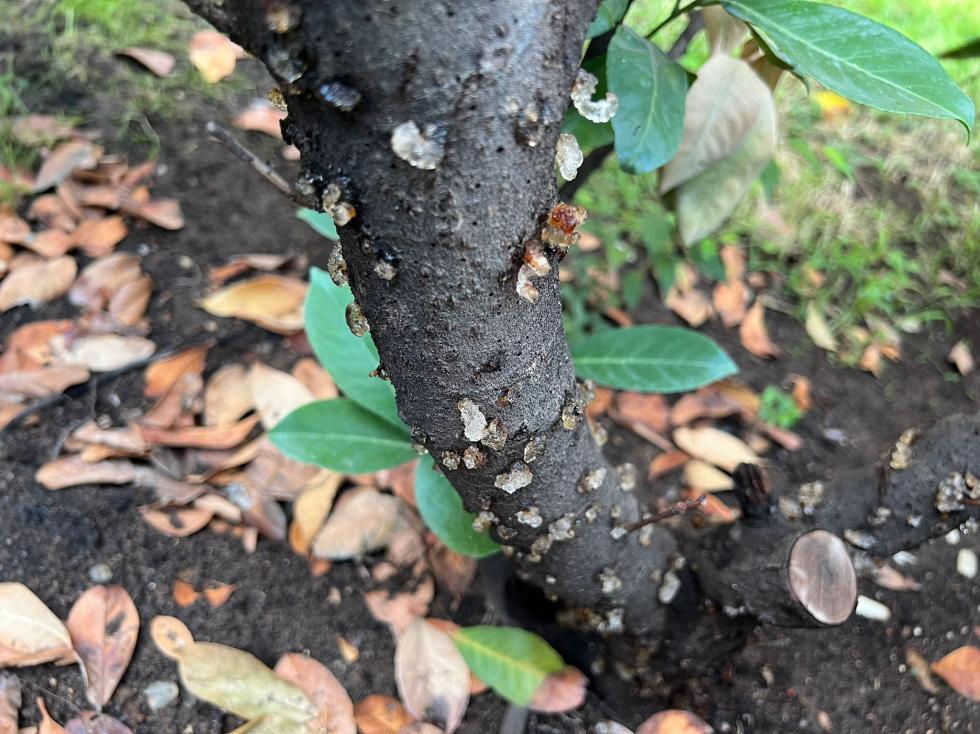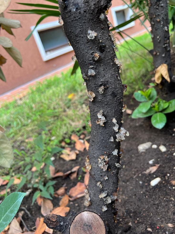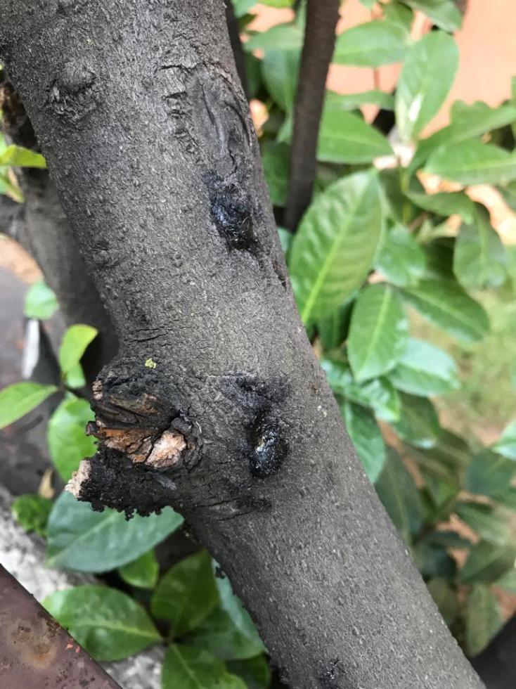 Grazie per l'impegno ma non sono in grado di aggiungere altro a quanto già detto. Non sembrerebbe ci siano fori, dunque le alternative restano: gommosi non parassitaria, cancri rameali da crittogame (es. Sphaeropsis malorum, ma sono parecchi gli agenti patogeni responsabili di cancri, e nel caso servirebbe una diagnosi da laboratorio).