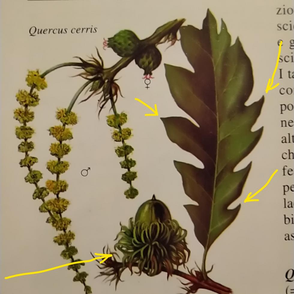 caratteristiche foglia del quercus cerris = cerro la foglia ha bordo con cosiddetti lobi mucronati all'apice, e la ghianda ha una forma detta a parrucchetta