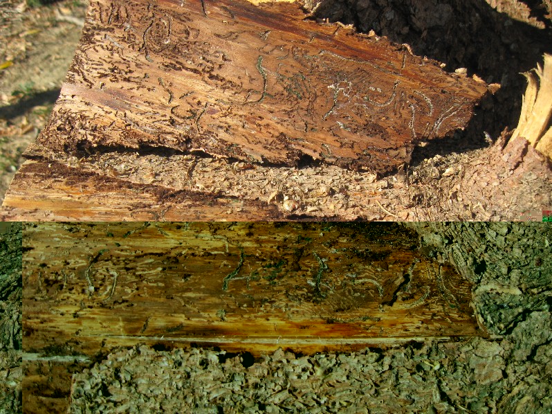 Ecco altre foto, di un ramo di abete che sta per morire e di pezzi di tronco di abeti già secchi, dove si vedeno le gallerie. Leggendo nei link sembrerebbe proprio questo Bostrico. Appena si toccano i rami della pianta colpita dall’insetto, gli aghi cadono istantaneamente anche se sono ancora verdi. Spero ora, che le temperature si sono abbassate, il Bostrico si fermi.