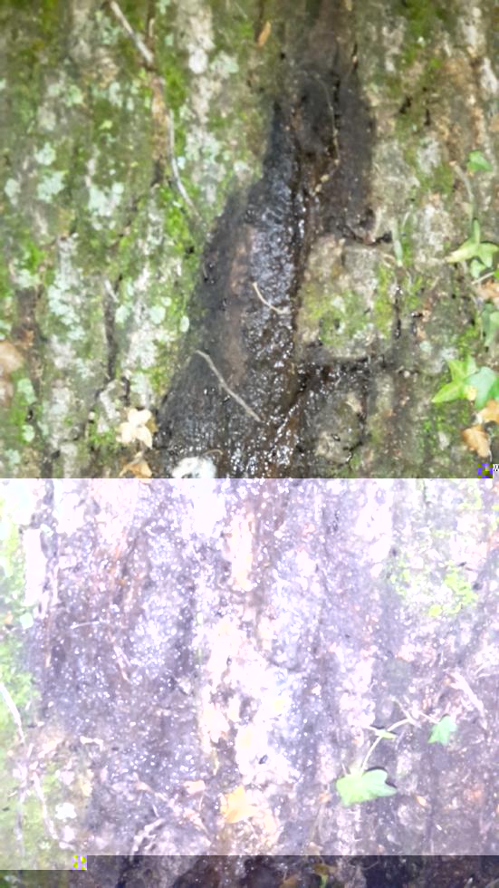 Confermo che il liquido che fuoriesce è schiumoso ed ha un forte odore, come di frutta fermentata e sta attirando molti calabroni. La fessurazione sembra unica con un paio di punti da cui fuoriesce liquido.