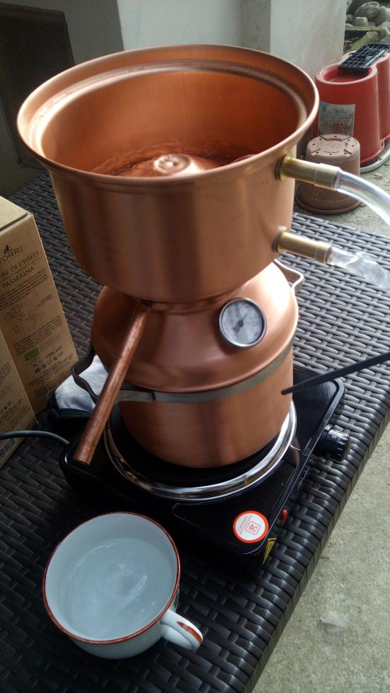 ho riscaldato l'alambicco lentamente con un fornello elettrico e ho raffreddato la parte superiore con acqua corrente usando gli appositi condotti di cui è fornito l'alambicco.