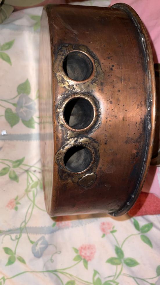 Buongiorno sono in possesso di un vecchio distillatore di rame della prima metà del '900 che vorrei riscaldare in maniera sicura. A giudicare dalla targhetta (seconda foto allegata), che si trova su un lato dello strumento, probabilmente in origine veniva riscaldato attraverso l'utilizzo di resistenze elettriche che ahimè sono ora mancanti. Credo che queste resistenze venissero inserite attraverso i fori della terza figura colleganti l'esterno a tre camere cilindriche idraulicamente separate dalla camera del liquido. Dopo varie ricerche mi sono imbattuto nelle resistenze cilindriche ad immersione ma da quello che credo di aver capito sono utilizzabili solo immerse in un liquido; quindi non adatte al mio caso.