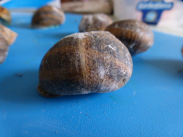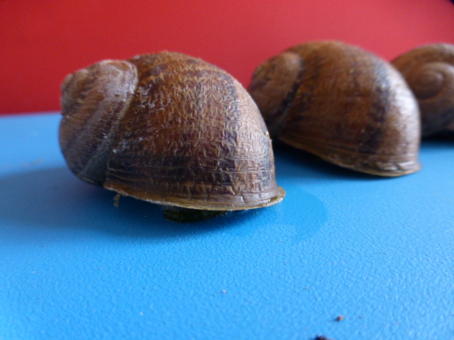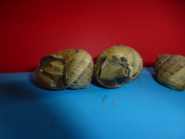 Foto 5: osservando i soggetti ventralmente e` ancora piu` facile riconoscere chi sta iniziando a bordare e chi no, inoltre il margine appena rialzato della seconda lumaca non e` ancora "bianco", non ha ancora assunto la caratteristica colorazione avorio di un soggetto adulto ed infatti il guscio e` ancora "morbido".