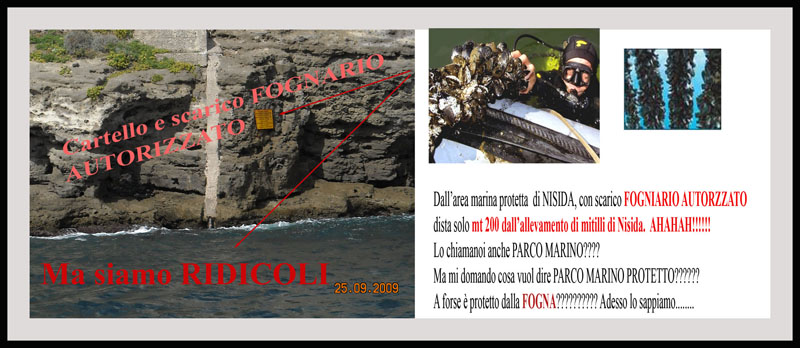 Ti faccio un esempio sarà pure di un'altro campo similare. Nel golfo di Napoli, ci sta l'isolotto di Nisida con carcere minorile, in questo isolotto si mantengono dopo terapie fatte all'acquario Dohrn le famose tartarughe carretta carretta, a distanza di 150 mt ci sta uno dei più grossi allevamenti di mitili ( cozze) del golfo di Napoli, quest'area è stata definita AREA MARINA PROTETTA, ma lo sai cosa c'è UNO SCARICO FOGNARIO AUTORIZZATO, del carcere minorile. Forse ci siamo dimenticati il COLERA a Napoli??????? Spero di essere stato esudiente Ti allego la foto se caso mai con il mio scritto non fosse chiaro