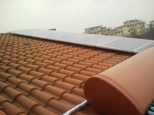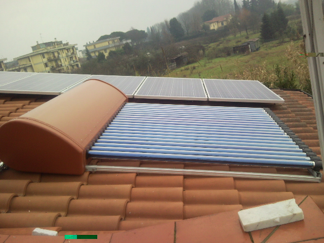 Allora come promesso ecco le foto  le foto dell' impianto solare sono riuscito a farne solo matà,  dove si vede anche quello che produce acqua calda  l'altra metà è sul tetto più in alto, siccome è una mansarda per ora non sono riuscito a fotografarlo  e poi una foto dell' inverter.