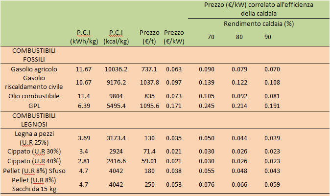 Ecco il confronto tra i prezzi di alcuni combustibili fossili e legnosi: