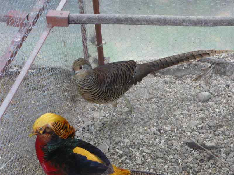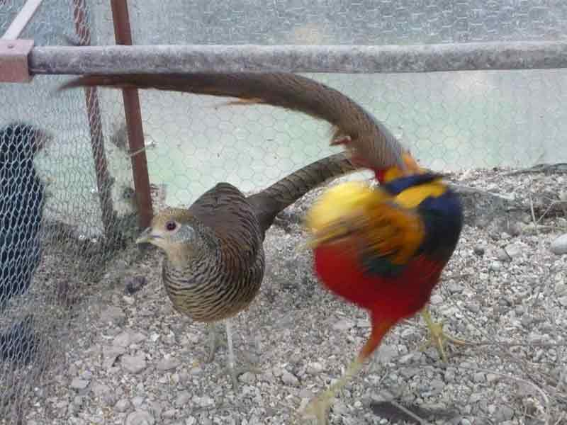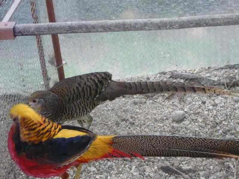 Bella coppia, però purtroppo presentano segni di ibridazione con il fagiano lady amherst. La femmina ha zampe troppo scure che tendono al grigio, dovrebbero essere gialle, ed un colore del piumaggio anch’esso troppo scuro, non so se è la foto ma dovrebbe presentare tonalità più chiare che si avvicinano al giallo. Nel maschio i caratteri di impurità sono più evidenti. Il ciuffo sulla sommità del capo ha tracce di rosso che non dovrebbe esserci e le guance sono troppo scure.