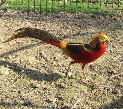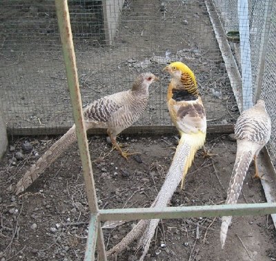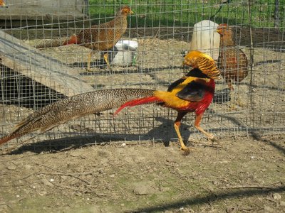 Volevo mostravi queste foto fatte a dei fagiani di un allevatore per avere un parere. L’idea che mi sono fatto io guardando questi esemplari è che il maschio del dorato rosso presenta qualche difetto, il più evidente è la presenza di tracce rosse sul ciuffo dorato della testa, la mantellina del collo mi è sembrata di un giallo un po’ sbiadito e forse, è anche un difetto, la presenza di troppe piume gialle che vanno inizialmente ha ricoprire le ali, situate subito sotto le verdi metalliche del dorso.