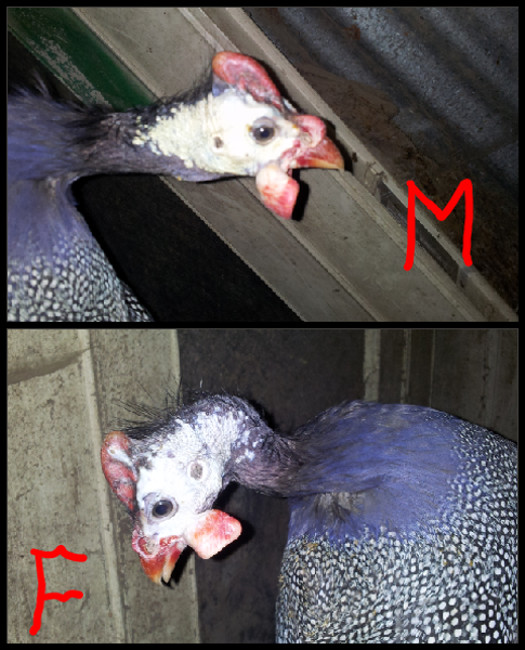 Il maschio di solito ha un incedere impettito e solleva spesso le ali come atteggiamento. La femmina sta sempre molto orizzontale come portamento della schiena , inoltre il maschio non fa mai il verso lamentoso coquath coquath coquath limitandosi solo ai versi più striduli e nervosi ghheee greeeee greeeeei. Le faraone spesso sono infeconde fino al periodo estivo e caldo . Andamenti stagionali avversi con forte piovosità possono interferire. E' vero anche che alle volte nei ceppi commerciali esistono femmine molto mascoline che sembrano maschi per i caratteri sessuali secondari con bargigli arricciati e non piatti ed elmo corneo pronunciato. Osservale e ascoltale capirai così di preciso il sesso.