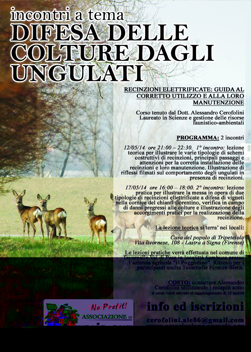 Incontri promossi dall'Associazione di Agraria.orgProgramma: 2 incontri12/05/14 ore 21:00 – 22:30. 1° incontro: lezione teorica per illustrare le varie tipologie di schemi costruttivi di recinzioni, principali passaggi e attenzioni per la corretta installazione delle recinzioni e loro manutenzione. Illustrazione di riflessi filmati sul comportamento degli ungulati in presenza di recinzioni.