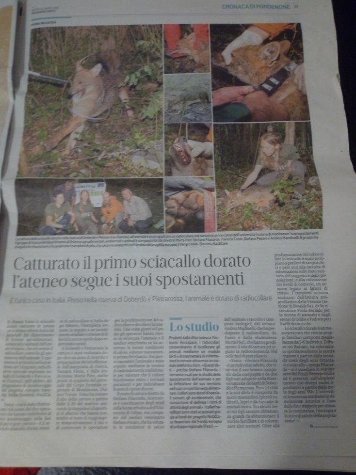 Dopo lo sciacallo dorato investito da un'auto e curato é stata programmata la cattura di uno in libertà per munirlo di radio collare. Studiato un percorso che é satto munito di esche per una maggiore frequentazione ed alla fine la cattura. Di questo si sa che ha una compagna e due cuccioli adulti in procinto d'abbandonare la famiglia. Si contano molti nuclei in Fiuli V.G. e diversi in tutt'Italia. La provenienza dei primi gruppi sono i Balcani.