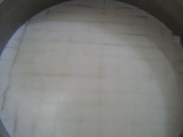 A 37°- 38° aggiungere il caglio e mescolare bene per almeno 30". Attesa 20'.
