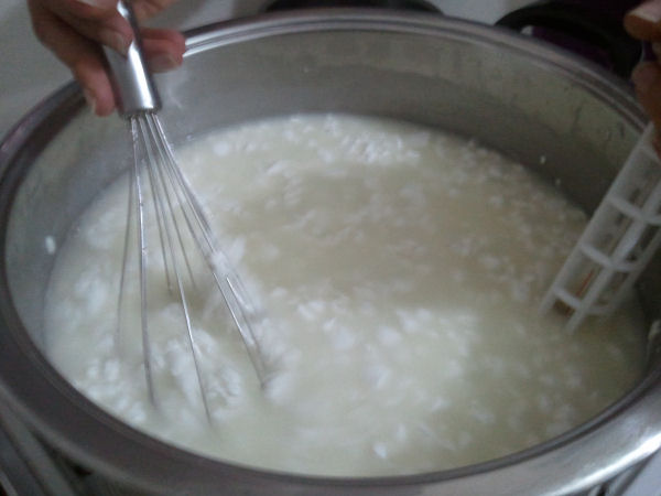 Taglio orizzontale con schiumarola più qualche rivoltamento, dopo procedere con frusta, delicatamente. Quando la cagliata arriva alla grandezza di nocciola, passare sul fuoco la pentola e continuare a mescolare