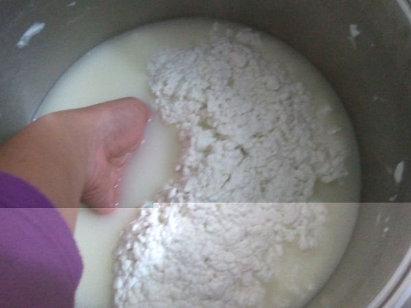 Prelevare la maggior parte del siero e stringere la "pasta" verso un lato della pentola.