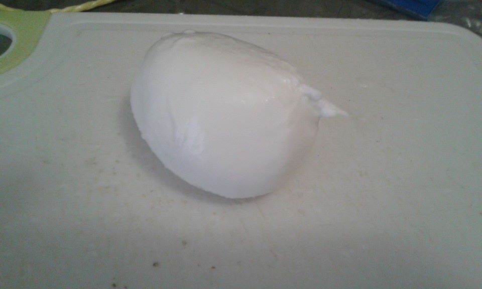 Stanotte mozzarella SUPER SUPER di bufala.........un successone........  . Sembrano dei contenitori di "latte", ho infilato la forchetta e una spruzzata di latte mi ha macchiato la maglia.....  . Mai ottenute delle mozzarelle in questo modo, morbidissime e dire che sono succose è un 'eresia, sono micidiali. Morbidezza assurda.... Lavorato i miei soliti 5 litri di latte, 1.400 Kg di mozzarelle......... Hanno una pelle fantastica e il liquido che vedete nella foto, è quello che è fuoriuscito semplicemente effettuando un taglio su una mozzarella di circa 100 grammi, dentro c'è n'era altrettanto..... Ola....