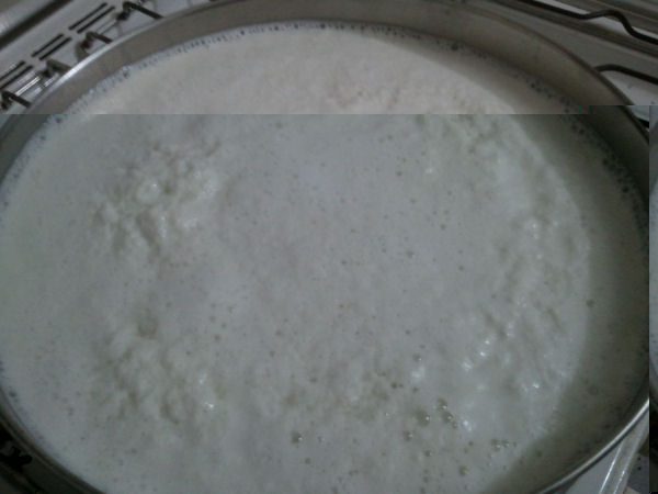 Porto il siero verso i 75°, mescolando delicatamente, inserisco a "filo" il latte.