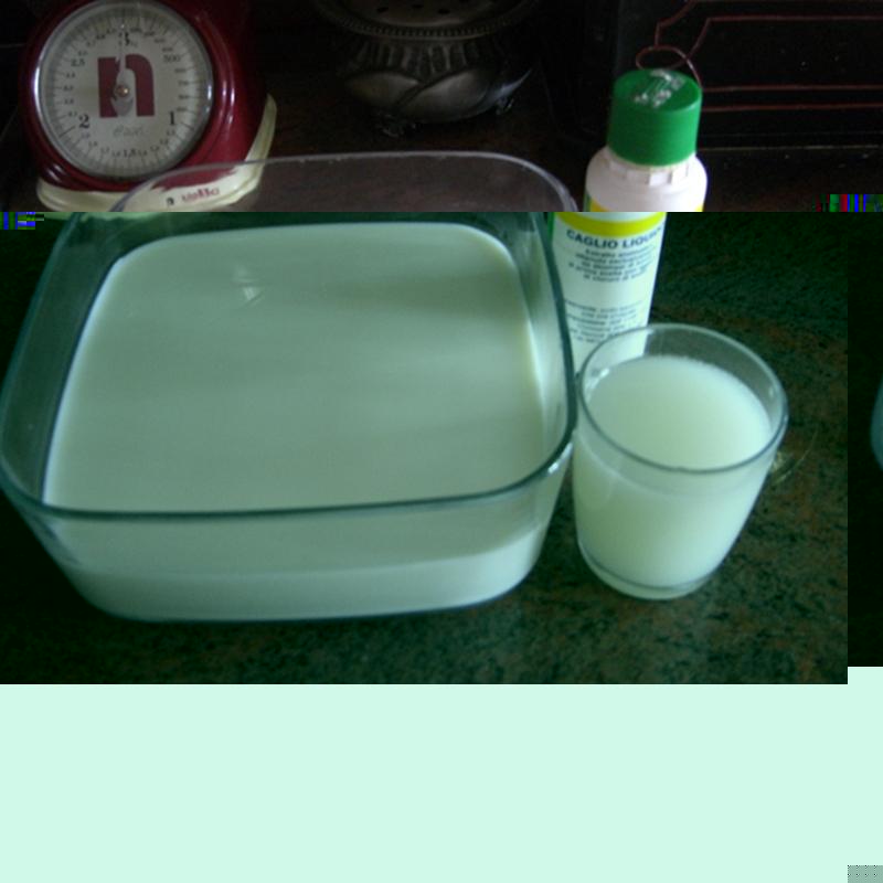 1.5 lt. latte intero di capra riscaldo a 34/35° e verso un bicchiere di siero della precedente lavorazione (la prima volta va bene un vasetto di yogurt intero da 125 gr.) verso poi una goccia di caglio liquido e mescolo bene tutto.