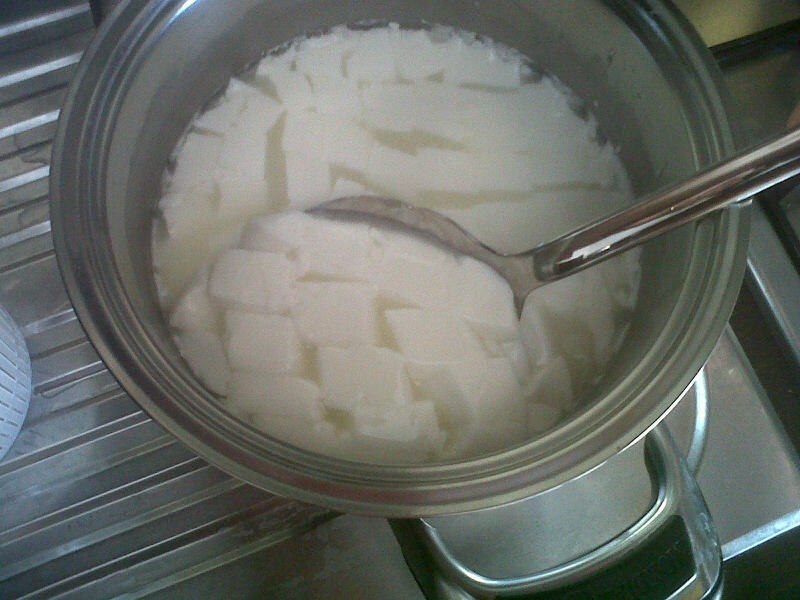 Dopo 35 minuti la cagliata è pronta ed effettuo l’unico taglio con una lama lunga in quadrati da 2.5/3.0 cm per lato.