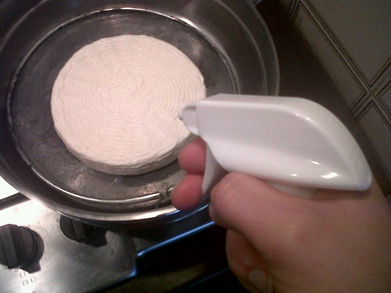 A questo punto tolgo la fuscella dal frigo e la lascio a temperatura ambiente per tutta la notte (20-21 gradi) e per altre 12 ore (di giorno temperatura 24-25 gradi), mantenendo sempre una coppa in plastica sopra e umidità compresa fra 85-90% grazie a tazzine di acqua calda.