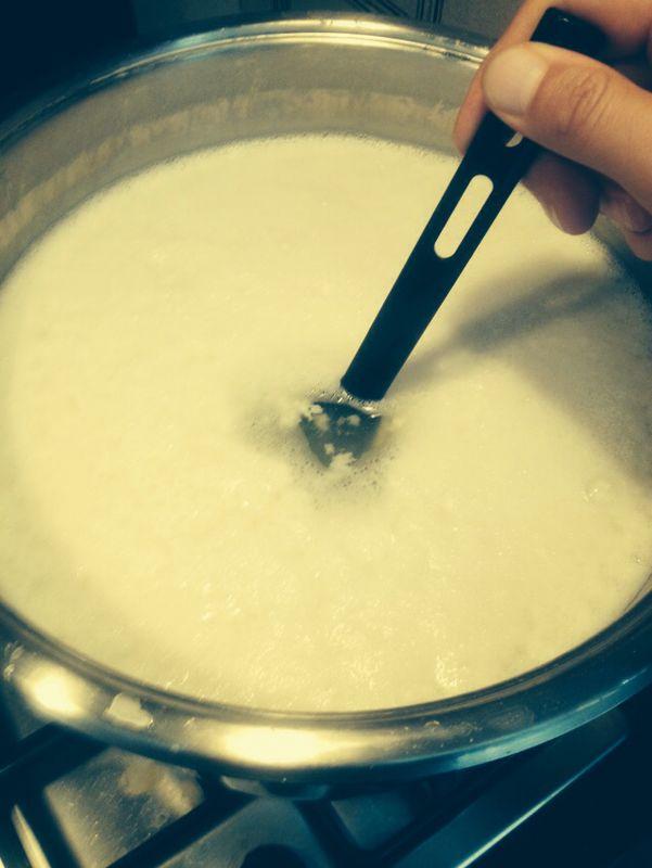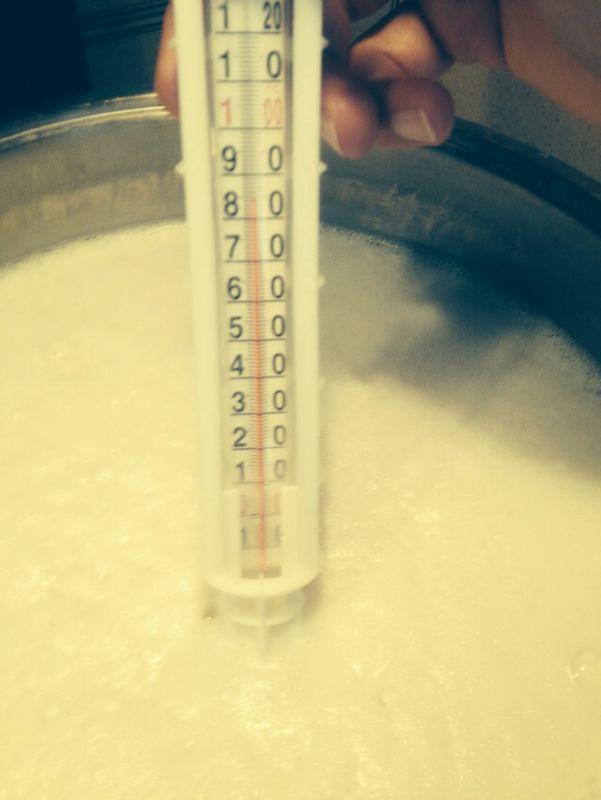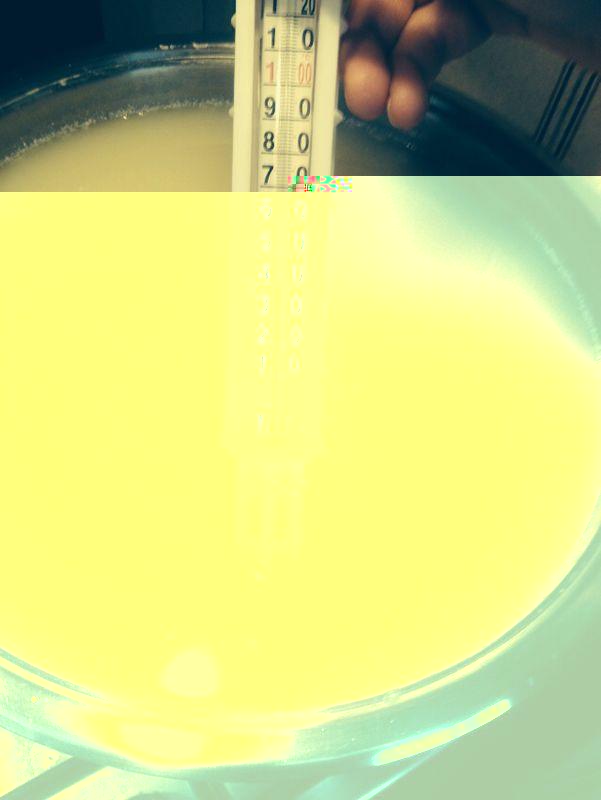 Parto da un siero a temperatura di 41 gradi e, a fuoco lento riscaldo fino a circa 82 gradi, temperatura a cui la ricotta inizia ad affiorare. A questo punto, inizia il procedimento vero e proprio.