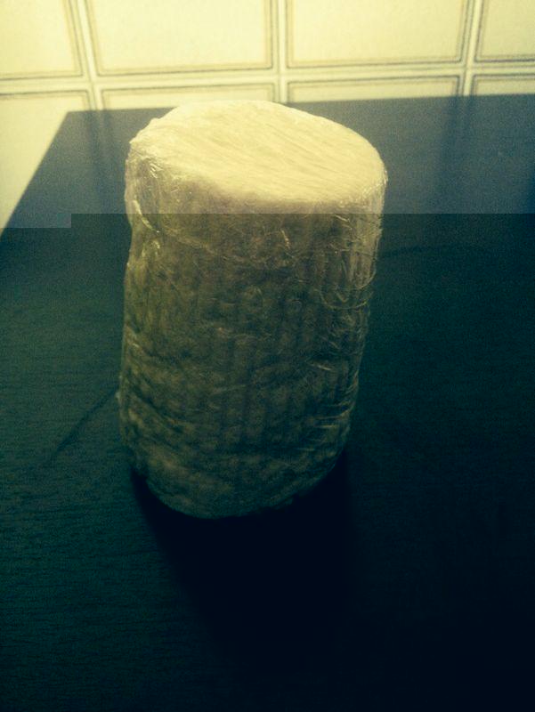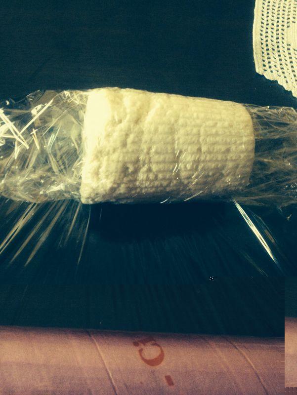 Prendo la ricotta, la tampono con della carta cucina, dopodiché, creo un sottovuoto artigianale ma perfettamente funzionante. Avvolgo la ricotta in una pellicola per uso domestico, chiudendo gli estremi. Osservando la ricotta avvolta dalla pellicola, vedo che in alcuni punti (avvallamenti della superficie verticale ed in prossimità delle impronte delle righe della fuscella), c’è dell’aria.