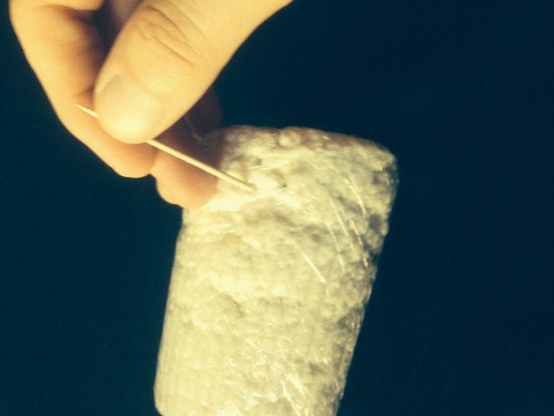 Siccome l’aria insieme all’umido favorisce il crearsi ed il proliferare delle muffe, con uno stecchino buco la pellicola dove c’è dell’aria, facendo aderire la pellicola alla superficie della ricotta e con un altro velo di pellicola riavvolgo per bene la ricotta già avvolta nell’altro foglio di pellicola.