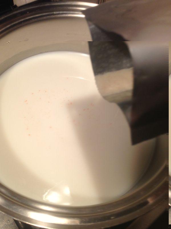Ho lasciato la pentola a temperatura ambiente (24 gradi). Dopo due ore, il latte ha raggiunto il ph di 6,4 e, a questo punto inserisco una goccia di caglio, mescolo e lascio di nuovo a temperatura ambiente per tutta la notte.