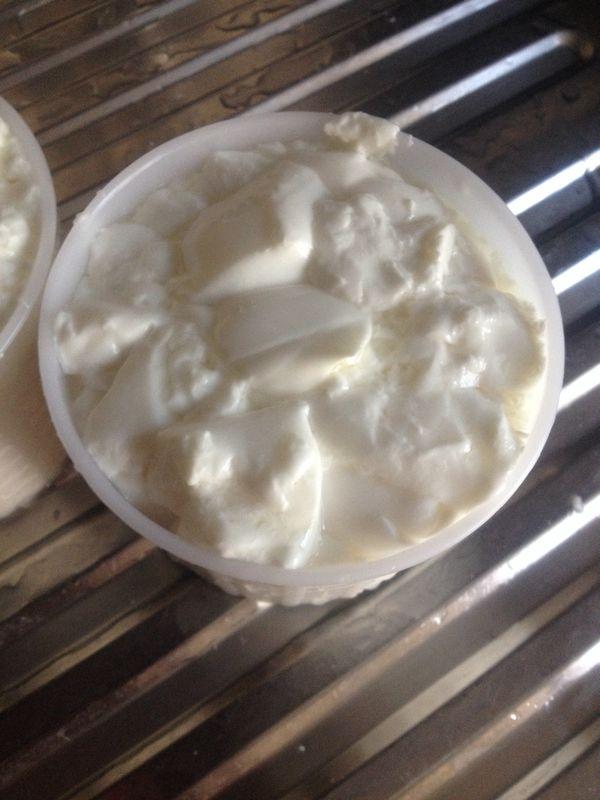 L’indomani mattina, a 11 ore dall’aggiunta dei fermenti e a 9 dall’aggiunta del caglio, la cagliata è pronta, si presenta con circa 1 centimetro di siero sopra la sua superficie; misuro il ph che è perfetto 4.4 e metto la cagliata in due fuscelle rotonde senza far spappolare troppo la cagliata stessa.