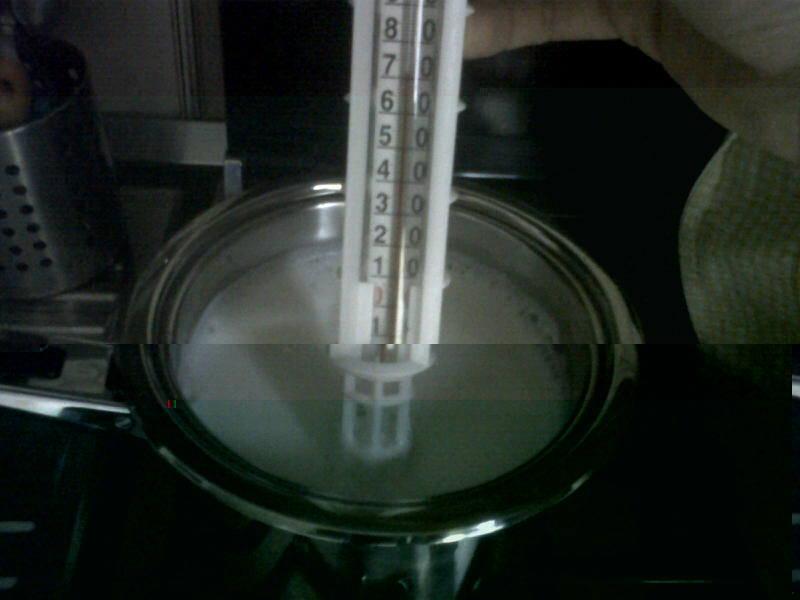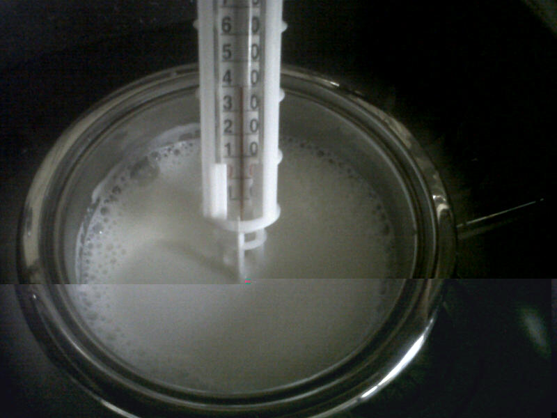 Pastorizzo 1 litro di latte ovino, miscelato con mezzo litro di latte di capra, porto a 72 gradi e poi abbatto rapidamente a 39°.
