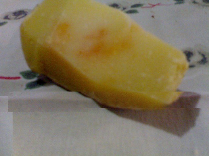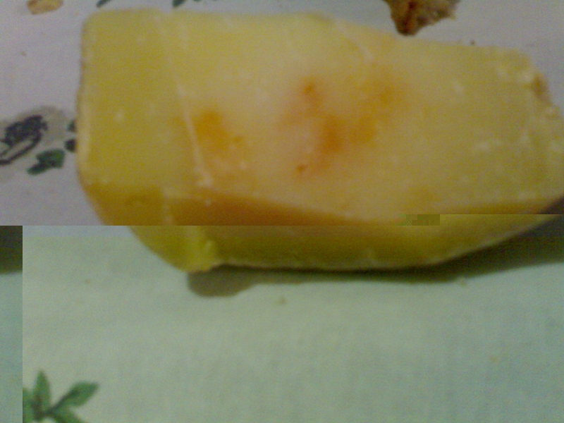 La lavorazione risale a Giugno...nel locale utilizzato la temperatura era sui 17 °C... la presenza di queste macchie non ha alterato in alcun modo il sapore...Il caglio era liquido donato direttamente dal pastore...ottenuto in modo naturale dall'abomaso di agnello..