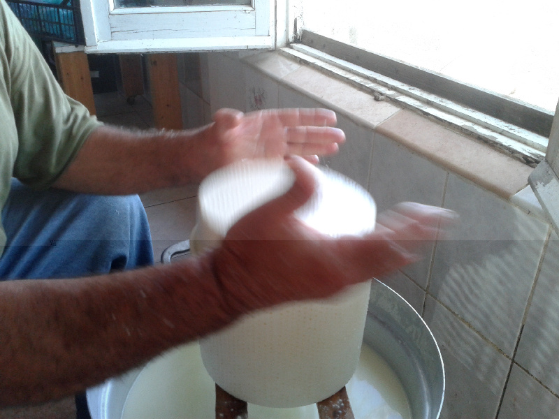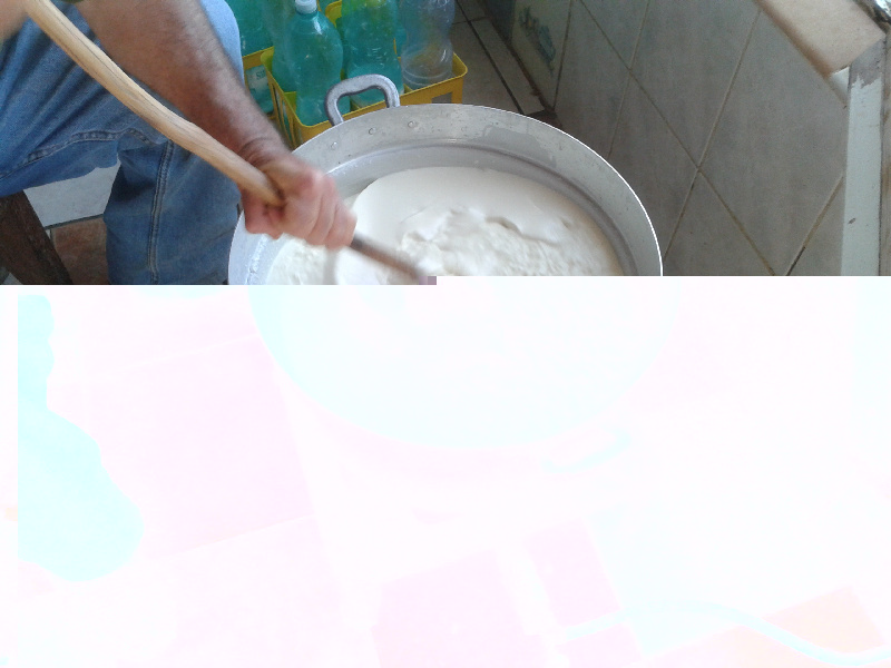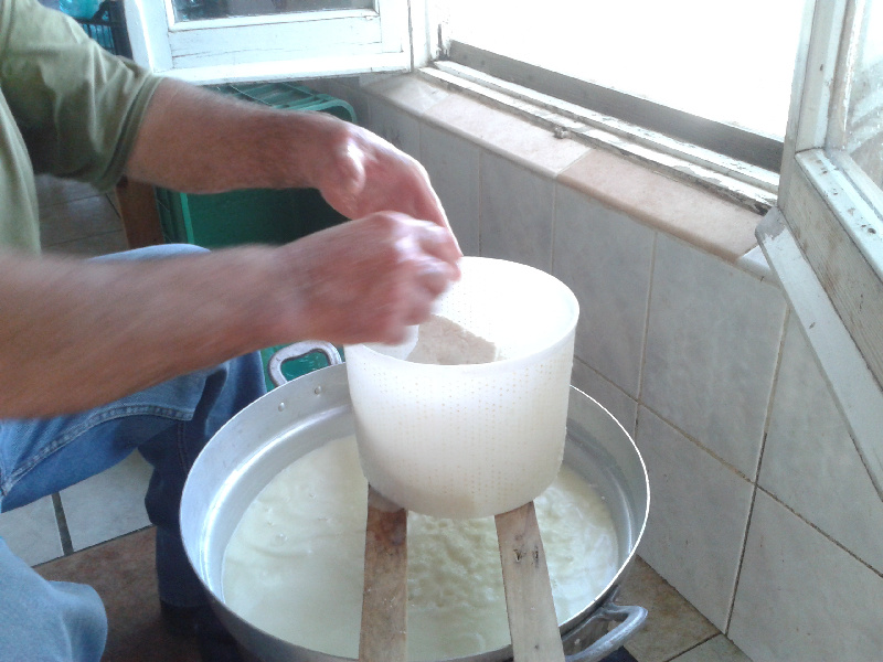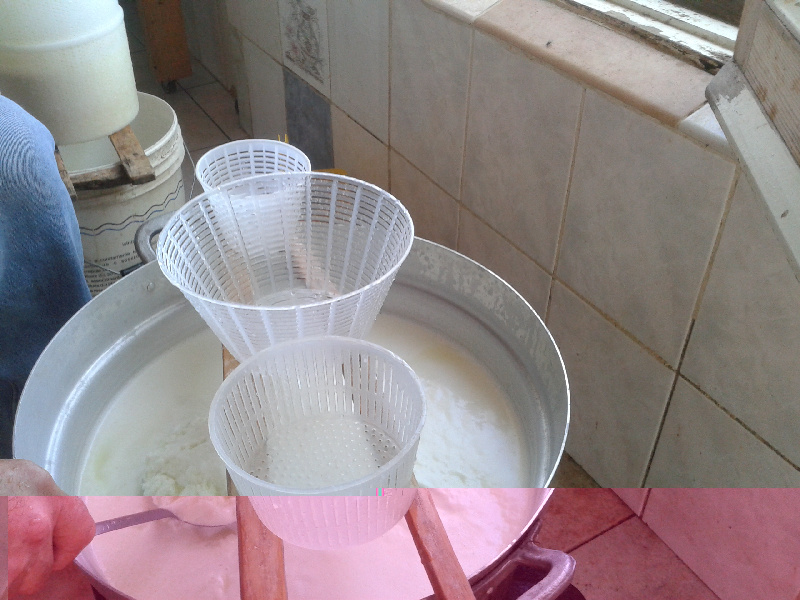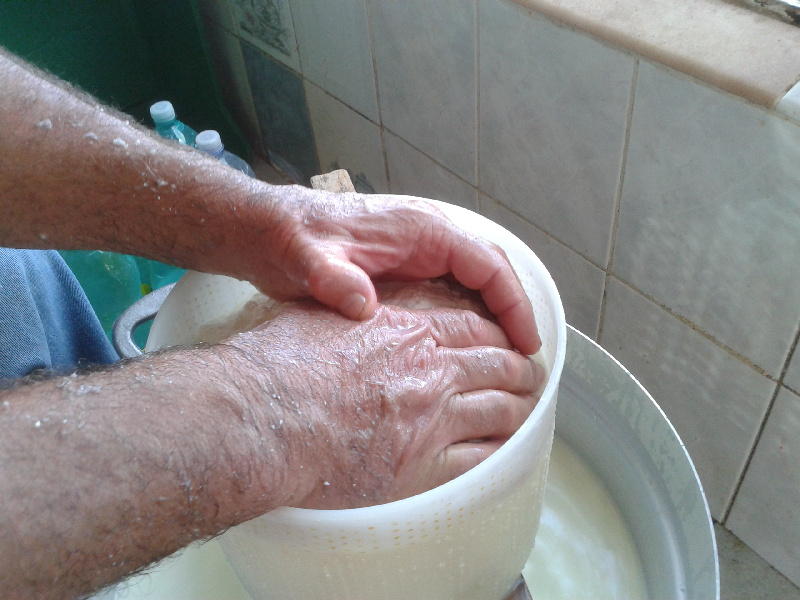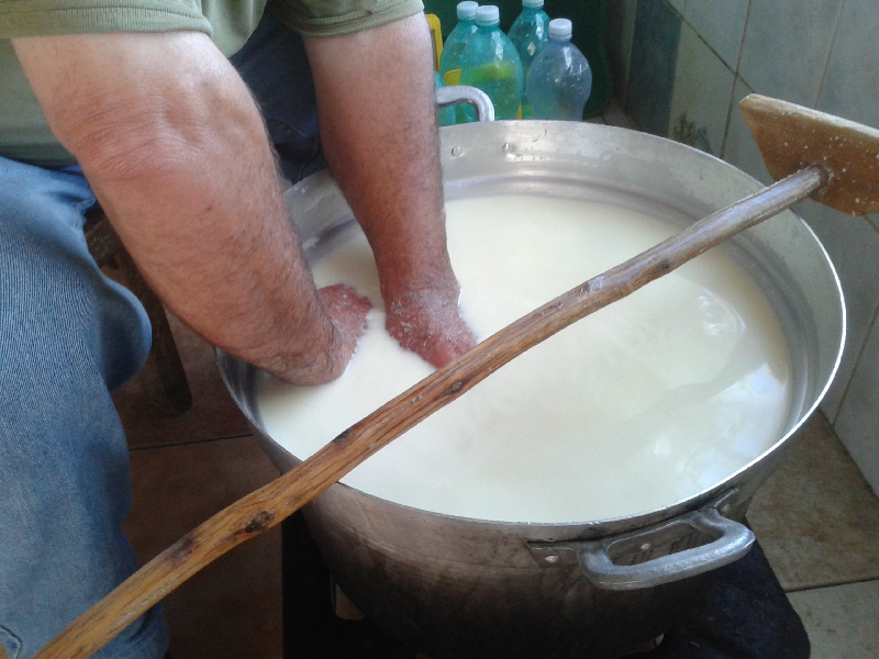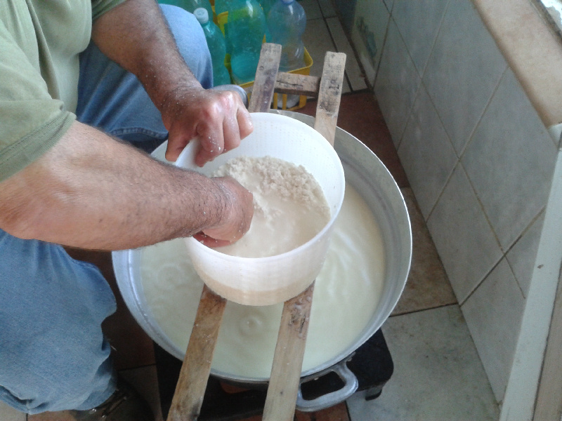 Il siero viene costantemente agitato col bastone, una sorta di paletta da croupier, per intendersi, ovviamente fatta interamente a mano con legno di olivastro. Quando il siero inizia a formare la prima schiuma in superficie, aggiunge circa un litro di latte (non mette sale) Allegato: