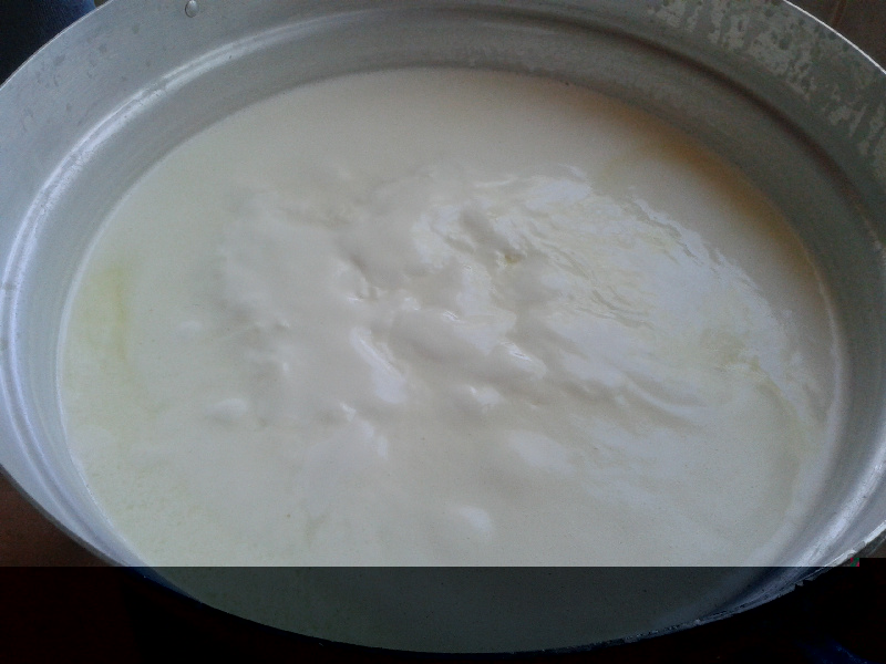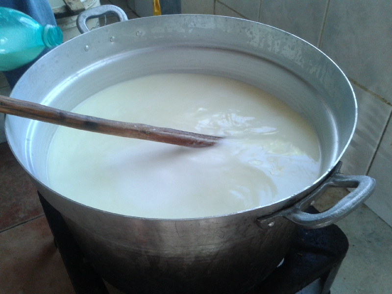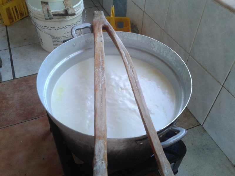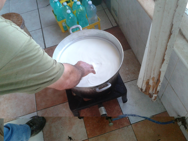 Finita la mungitura, filtra il latte (+ o - una quindicina di litri) e aggiunge circa 10 lt di latte del giorno prima. Accende il fornello e controlla la temperatura usando il dito. Mentre riscalda mi spiega che la temperatura ottimale è quando immergendoci il dito 'non senti differenza col tuo corpo'. Girando continuamente innesta, sempre durante il riscaldamento, un cucchiaio da minestra non colmo di caglio liquido di vitello. Allegato: