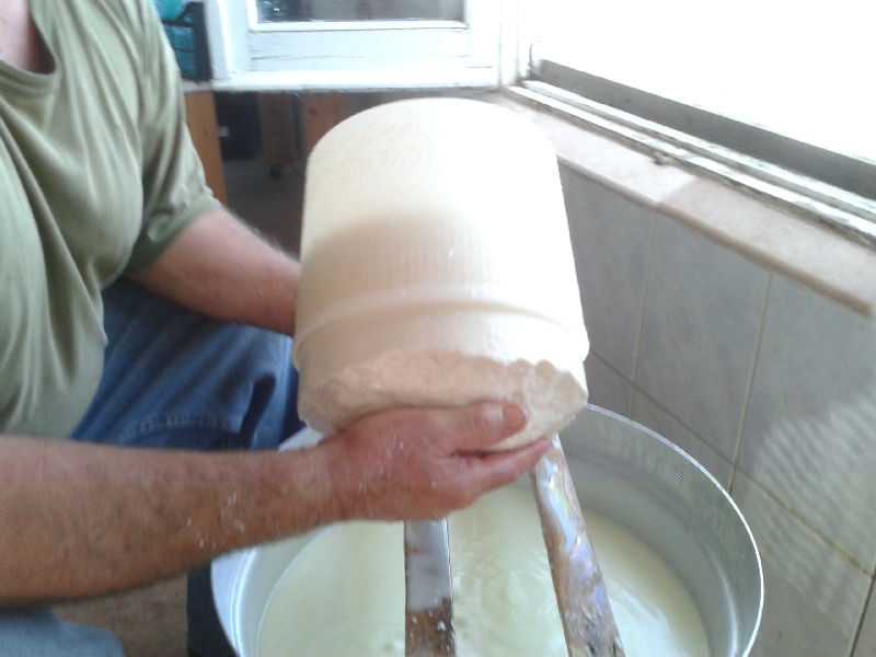 Alla temperatura giusta spegne il fornello e mette una coperta. La sosta si è protratta per circa 40 minuti. La cagliata viene rotta direttamente col suo bastone, senza tagli, o spino. Allegato: