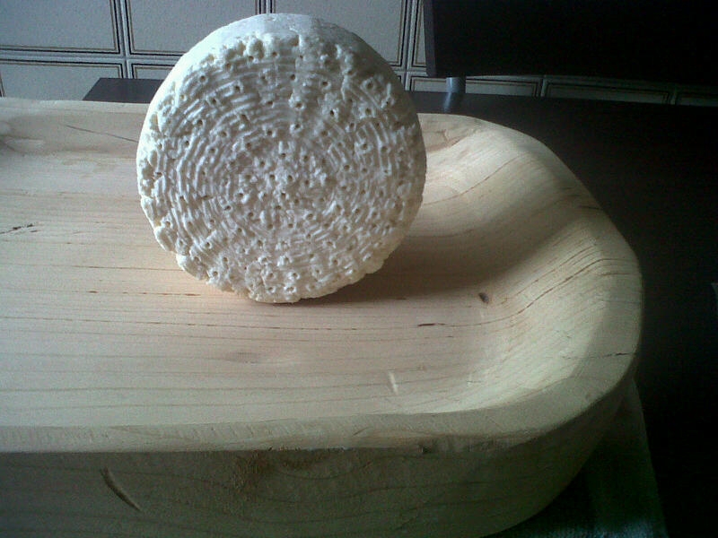 Stamattina, sono al nono giorno trascorso dalla produzione del Roquefort; ho misurato il ph con il ph-metro, facendo una breve incisione sulla forma per poter infilare la punta dello strumento e rilevare il valore. Il ph segna 5.2  , valore ottimale per uno sviluppo delle muffe Penicillium Roqueforti. Con un legno cilindrico (quello per spiedini) del diametro di circa 3mm, ho praticato 115 fori su un piatto del diametro di 14 cm. del Roquefort per quasi tutta l’altezza dello scalzo; ho tolto dalla fuscella e riposto la forma su un vassoio artigianale intarsiato a mano di QUERCIA non trattata ovviamente, materiale su cui viene stagionato il vero Roquefort nelle cave di Soulzon. Oggi ha inizio la prima parte della stagionatura che a differenza di altri formaggi, non va fatta con la forma adagiata sul piatto ma la forma deve poggiare sullo scalzo e va fatta ruotare per 5-6 volte al giorno. La stagionatura va fatta a 8-10 gradi ed umidità 90-95%; come ho fatto già per produrre la roulle, gli ho dedicato il piano alto del frigo dove ho quelle temperature e per l’umidità, mi aiuto con canovacci bagnati e nebulizzazioni delle pareti della porzione di frigo in questione e qualche tazzina di acqua calda.. Per quanto riguarda il ph del Roquefort, fra qualche giorno dovrebbe assestarsi intorno a valori di 4.9-5.0 per poi iniziare a salire fino a raggiungere valori che andranno da 7.0 a 7.40; se questo avverrà vuol dire che le muffe Roqueforti si stanno sviluppando nel modo appropriato. Ho fatto una scheda di rilevazione ph, su cui annoto giorno del rilevamento e valore rilevato in modo tale che a fine stagionatura avrò un grafico con dei valori e lo posterò anche per avere un valore aggiuntivo per chi si vorrà dilettare nella produzione di questo formaggio. Speriamo bene; a fra 10 giorni quando forerò l’altro piatto. Comunque quando ho fatto i fori, la forma dai buchi emana un odore sensazionale, da svenimento. Un saluto.