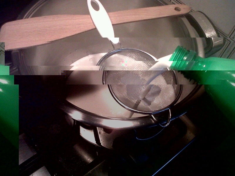 Il giorno dopo, utilizzo i 5,7 litri che mi sono rimasti; lo filtro con un colino a maglia fine e lo riscaldo a 30 gradi.