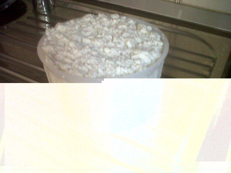 Lascio in questa situazione di pre-sgrondatura da siero per 45 minuti, rivoltando con delicatezza un paio di volte la cagliata che, a vederla mano a mano che passa il tempo, sembra polistirolo, segno che la diminuzione della coesione delle micelle stà avvenendo molto bene.