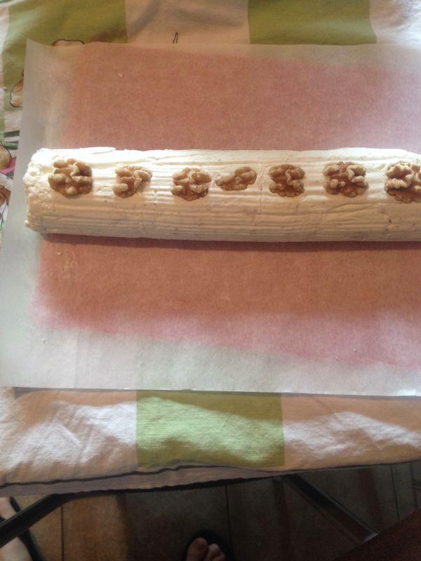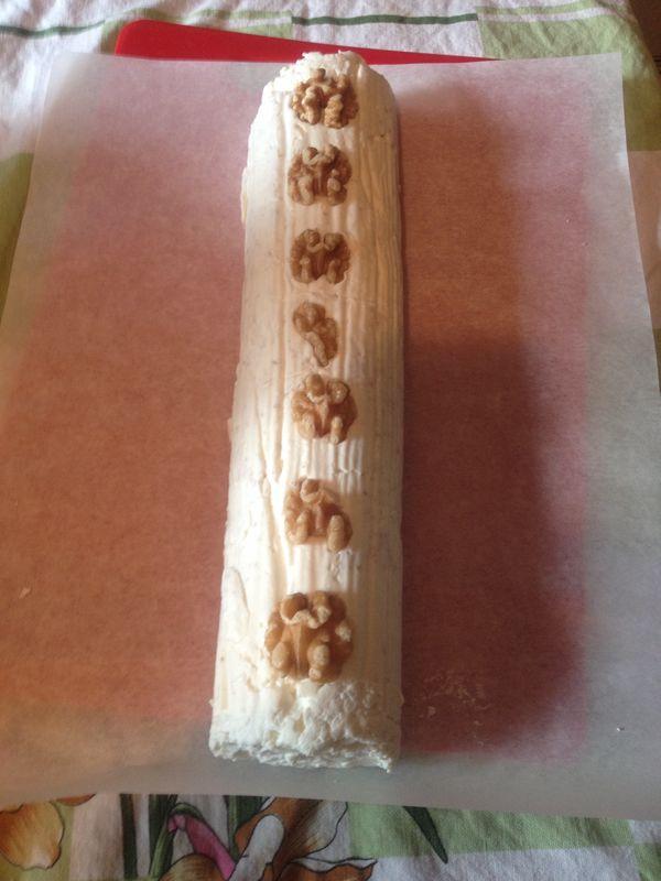 A questo punto adagio in frigo, dove il tronchetto si rassoderà un po’ e stasera ho consumato una parte del tronchetto, previo addobbo con noci intere sulla superficie.