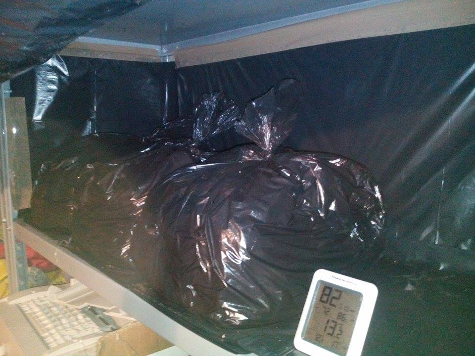 Ho pensato che avrei potuto far alzare un minimo la temperatura del ripiano dove riposano i sacchetti in cantina. ho applicato una tenda di pvc (un sacco nero da 120l) che lascia uno spiraglio di circa un cm dal basso in maniera da favorire il ricambio d'aria e allo stesso tempo permettere al calore sviluppato dal micelio di riscaldare un minimo l'ambiente. E' stata una mossa inteligente? qui di seguito le foto Allegato: