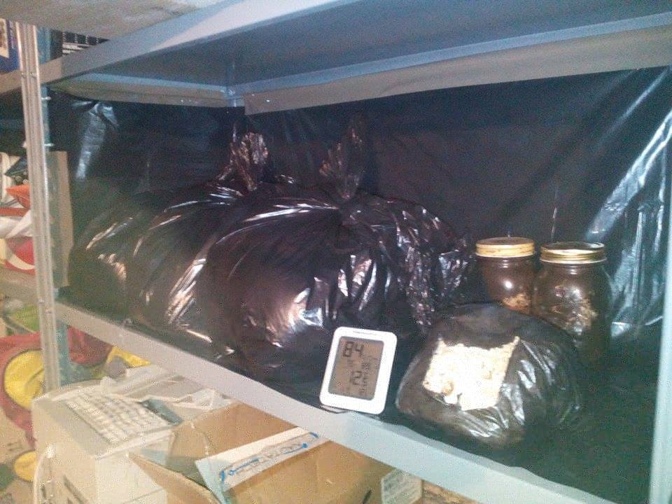 Infine, ho sostituito la plastica originale della balletta (Procedimento pericoloso, che rischia di mettere a repentaglio la fruttificazione) con un sacco nero intorno a circa 500 gr di micelio inoculato della balletta, ho praticato un'apertura per facilitare l'entrata della luce e la creazione del fungo.