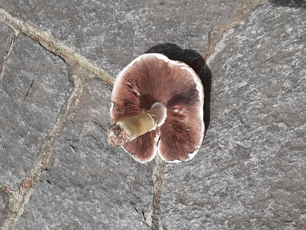 E' presumibile che sia un Agaricus campestris, il tono del colore gambo sembra un poco falsato dalla sporata-lamelle e la seconda foto è nettamente di colorazione diversa della prima, un poco ingiallita tendente a color crema. in futuro per fotografare funghi ,meglio metterli in ambiente con meno sole e fotografare in macro. le lamelle non sono nitide, e se raccolto fresco.... in caso di Agarici tagliare a metà, fare la sezione ed una foto alla carne del cambo intero e poi una seconda foto trascorsi 5 minuti. Ciao